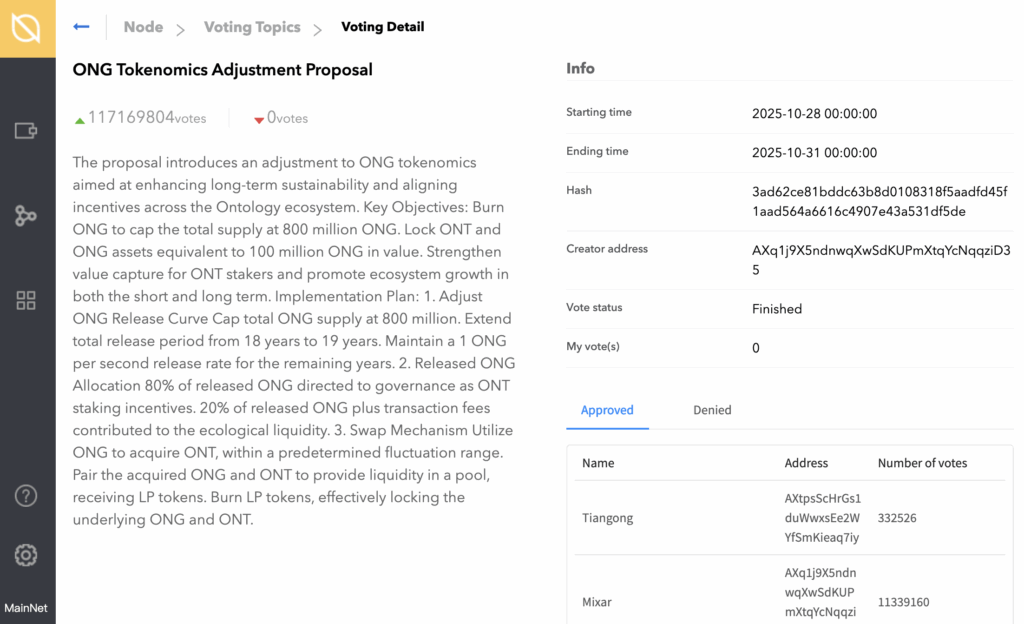 After three days of voting, from October 28 to October 31, 2025 (UTC), Ontology Triones Nodes reached a unanimous decision in favor of the proposal. The proposal secured over 117 million votes in approval, signaling strong consensus within the network to move forward with the next phase of ONG’s evolution.