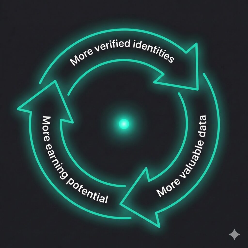 More users with verified decentralised identity means more valuable data available to buyers who need it. More data buyers willing to pay for verified sources means more earning potential for users who consent to share their data. More users earning income from their data means more participation and more network adoption. This creates a self-reinforcing flywheel. The infrastructure becomes exponentially more valuable as more participants join. First-mover advantage in building this infrastructure is real and significant. The early players will establish trust, liquidity, and network effects that create durable competitive advantages.