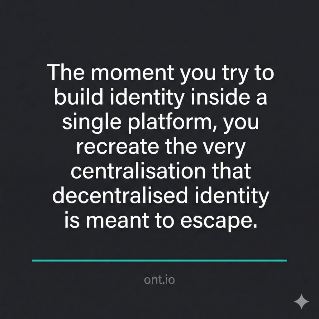 A single wallet cannot solve identity. A single application cannot solve identity. A single blockchain cannot solve identity. Why? Because identity only has value at network scale. You do not need to prove your identity to yourself. You need to prove it to others, to systems, to institutions. The moment you try to build identity inside a single platform, you recreate the very centralisation that decentralised identity is meant to escape. The moment you lock identity into a single blockchain or ecosystem, you eliminate portability. You trap users and their credentials. This defeats the purpose.