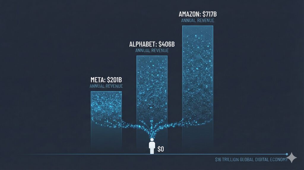 These three giants are not outliers. The global digital economy is estimated at approximately £16 trillion, roughly 15 per cent of world GDP. The majority of this value is captured by platforms that do not own the underlying data but have successfully extracted its value. You generate it. They monetise it. The transaction is so transparent it is nearly invisible.
